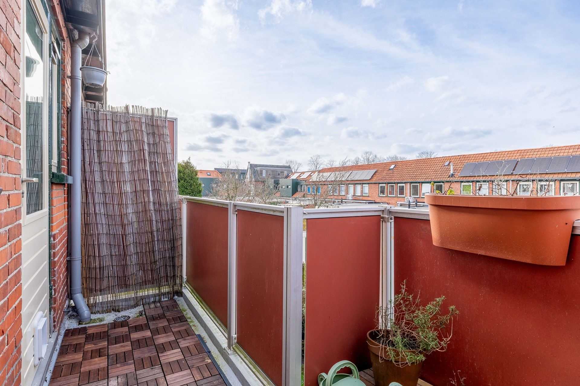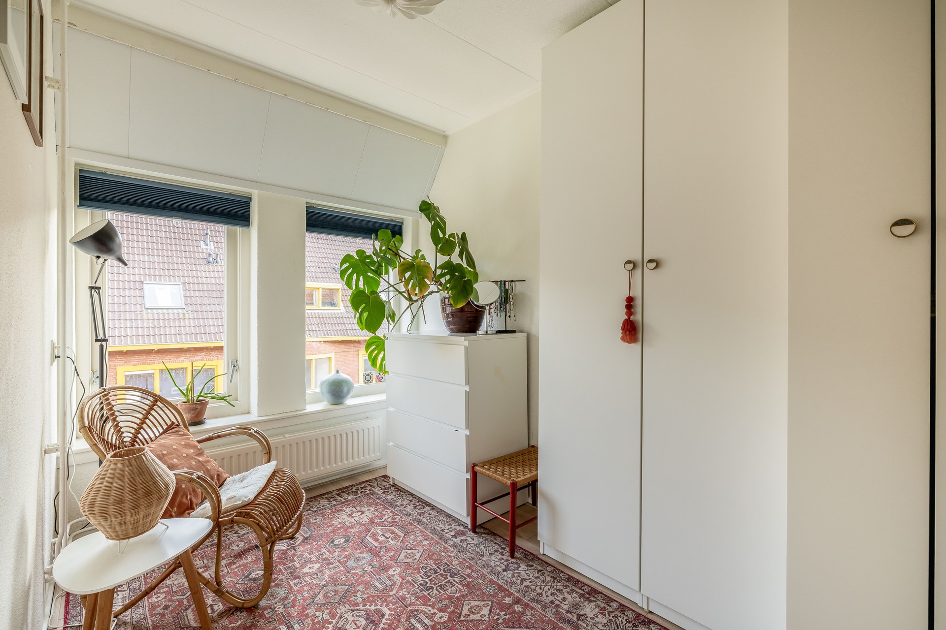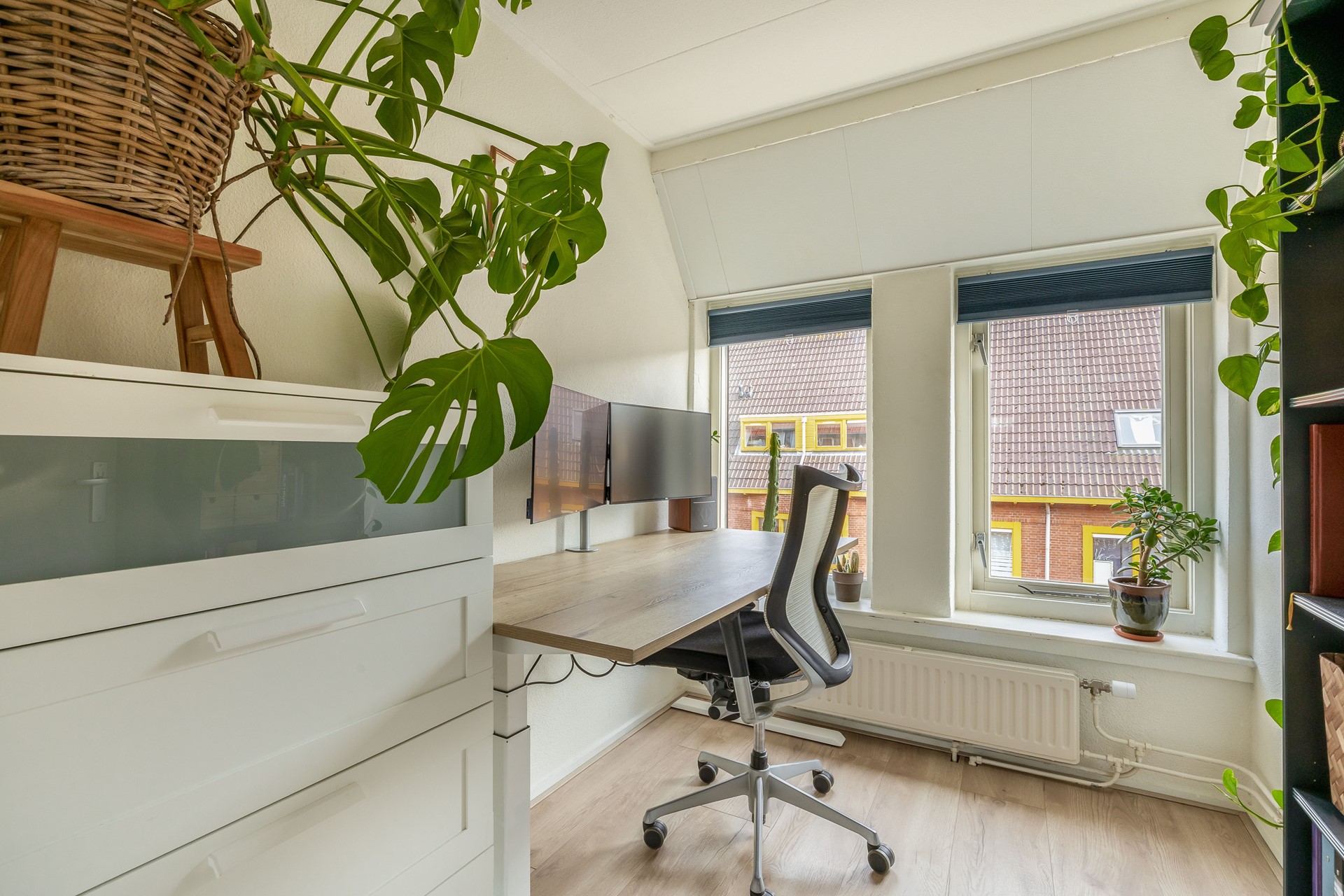 Op de verdieping bevinden zich drie slaapkamers (resp. ca. 9, 7 en 5,5 m²), wat het appartement verrassend ruim maakt. Of je nu een extra slaapkamer, werkruimte of hobbykamer nodig hebt: hier kan het allemaal. De badkamer is praktisch ingericht, met open douche, wastafel en handdoekradiator. Op de overloop zijn twee bergkasten aanwezig, daarnaast is via de vlizotrap de ruime vliering toegankelijk dus aan bergruimte is geen gebrek.