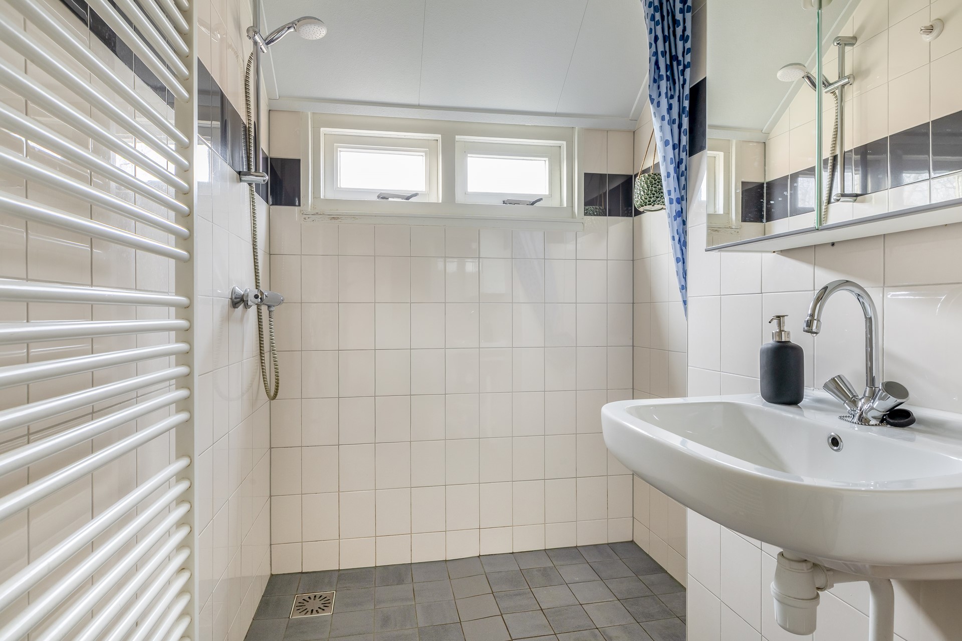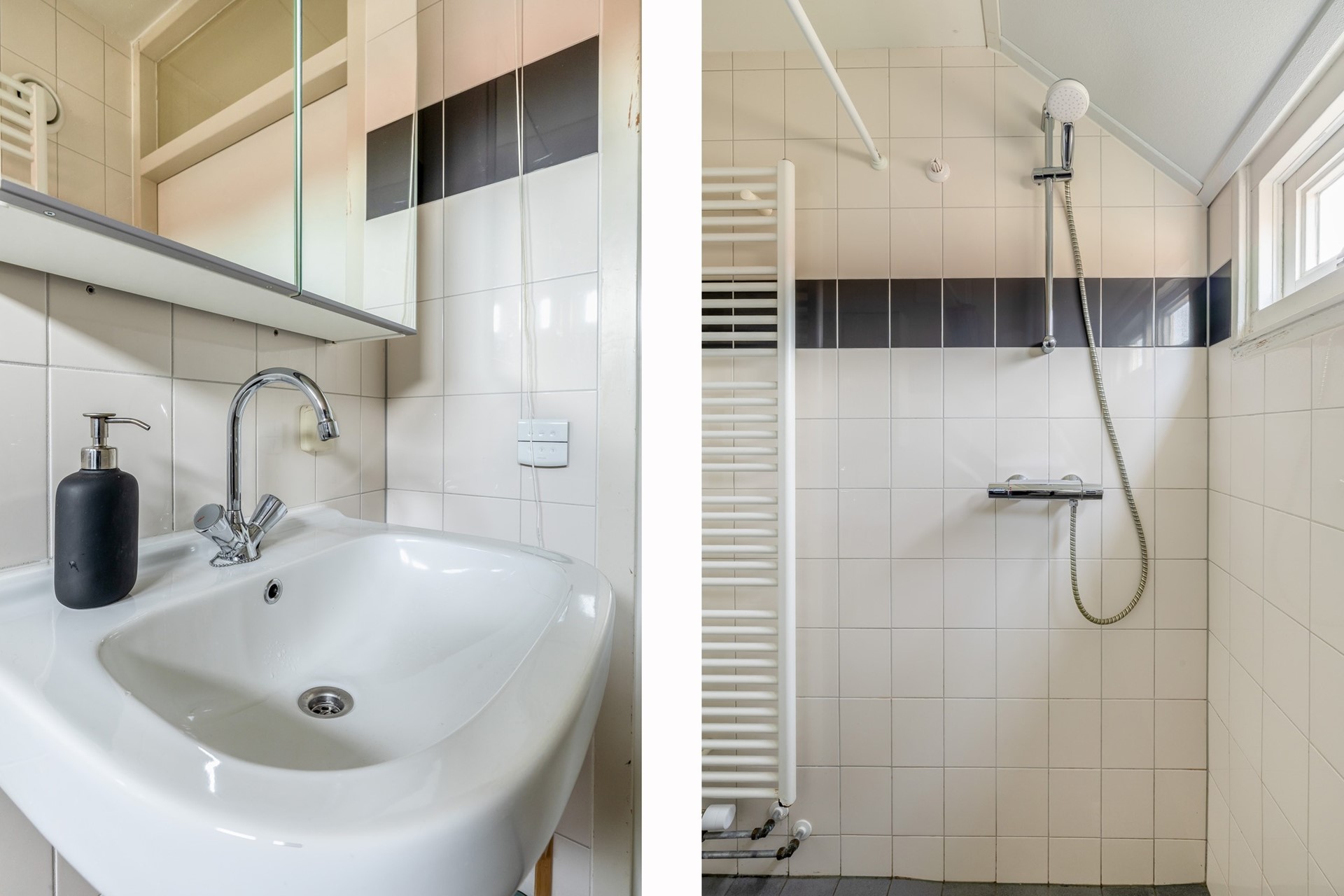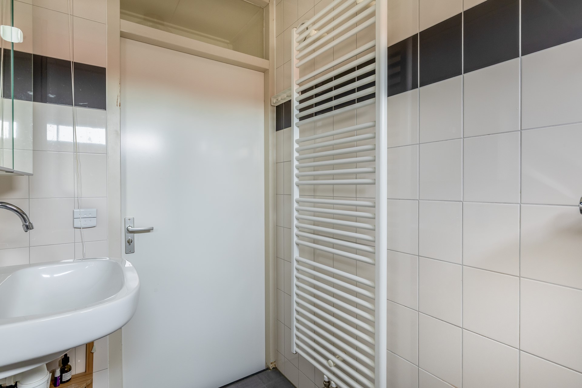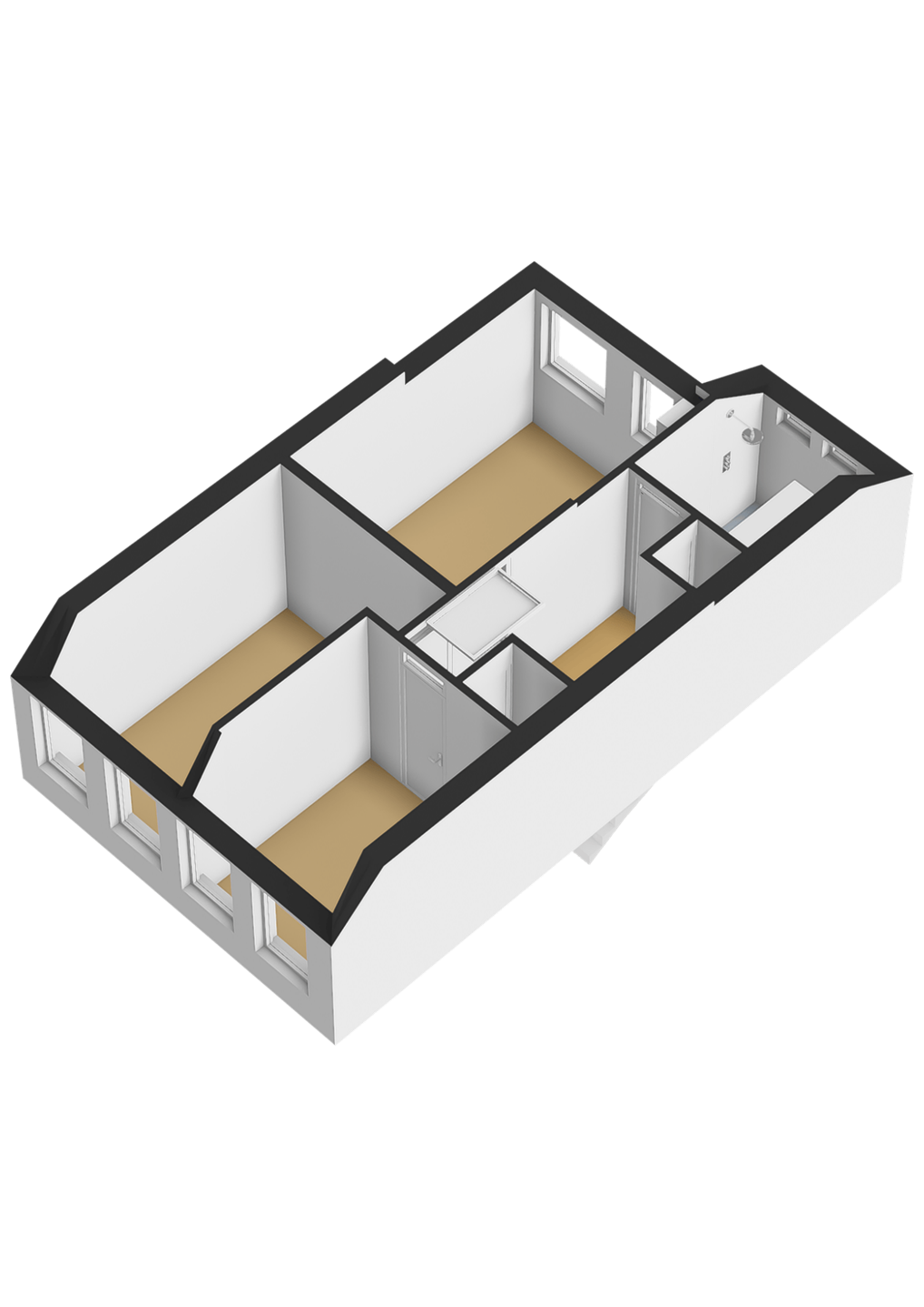 Op de verdieping bevinden zich drie slaapkamers (resp. ca. 9, 7 en 5,5 m²), wat het appartement verrassend ruim maakt. Of je nu een extra slaapkamer, werkruimte of hobbykamer nodig hebt: hier kan het allemaal. De badkamer is praktisch ingericht, met open douche, wastafel en handdoekradiator. Op de overloop zijn twee bergkasten aanwezig, daarnaast is via de vlizotrap de ruime vliering toegankelijk dus aan bergruimte is geen gebrek.