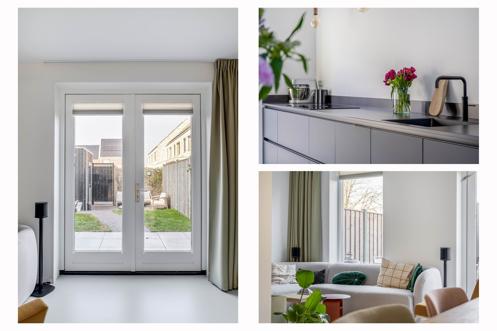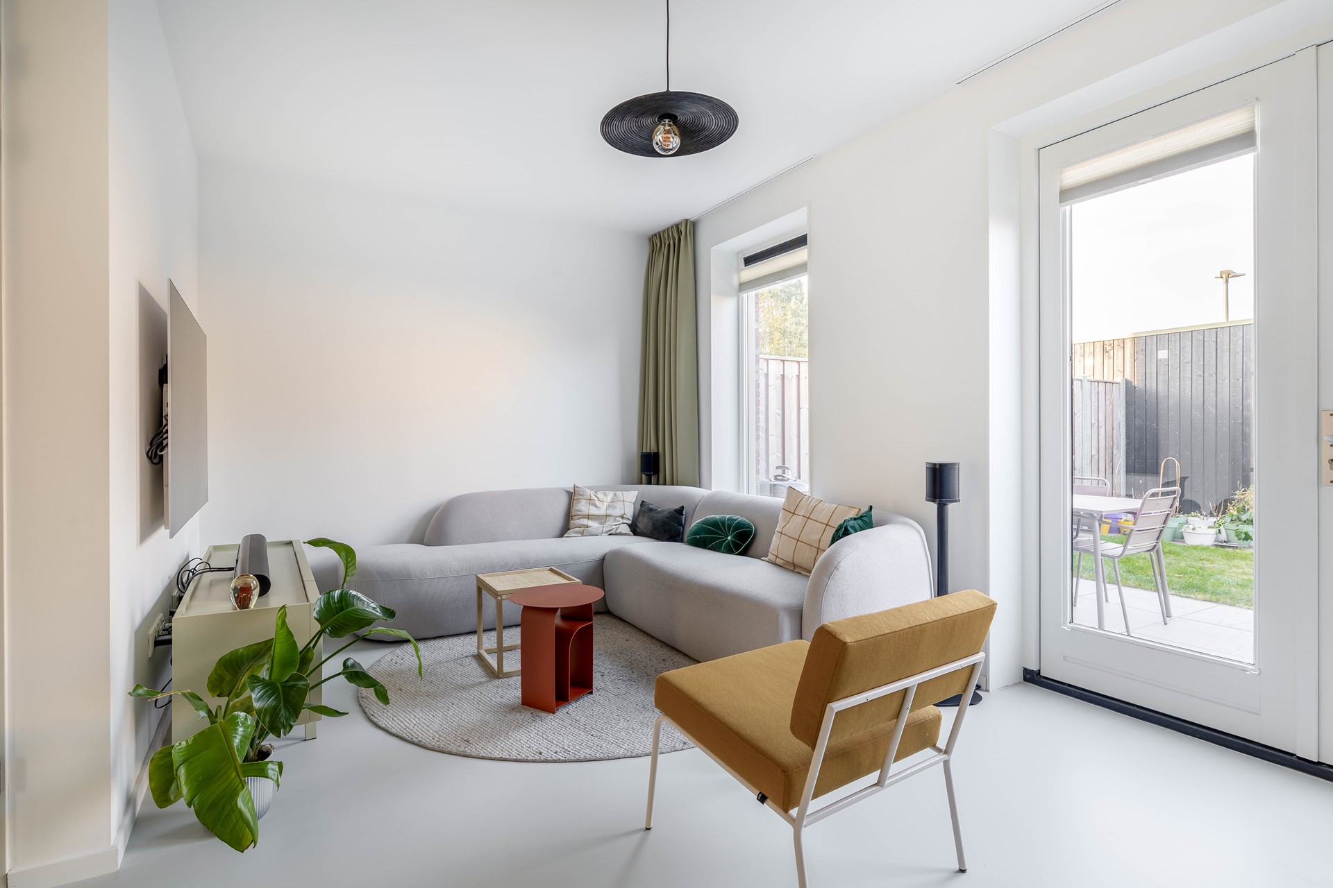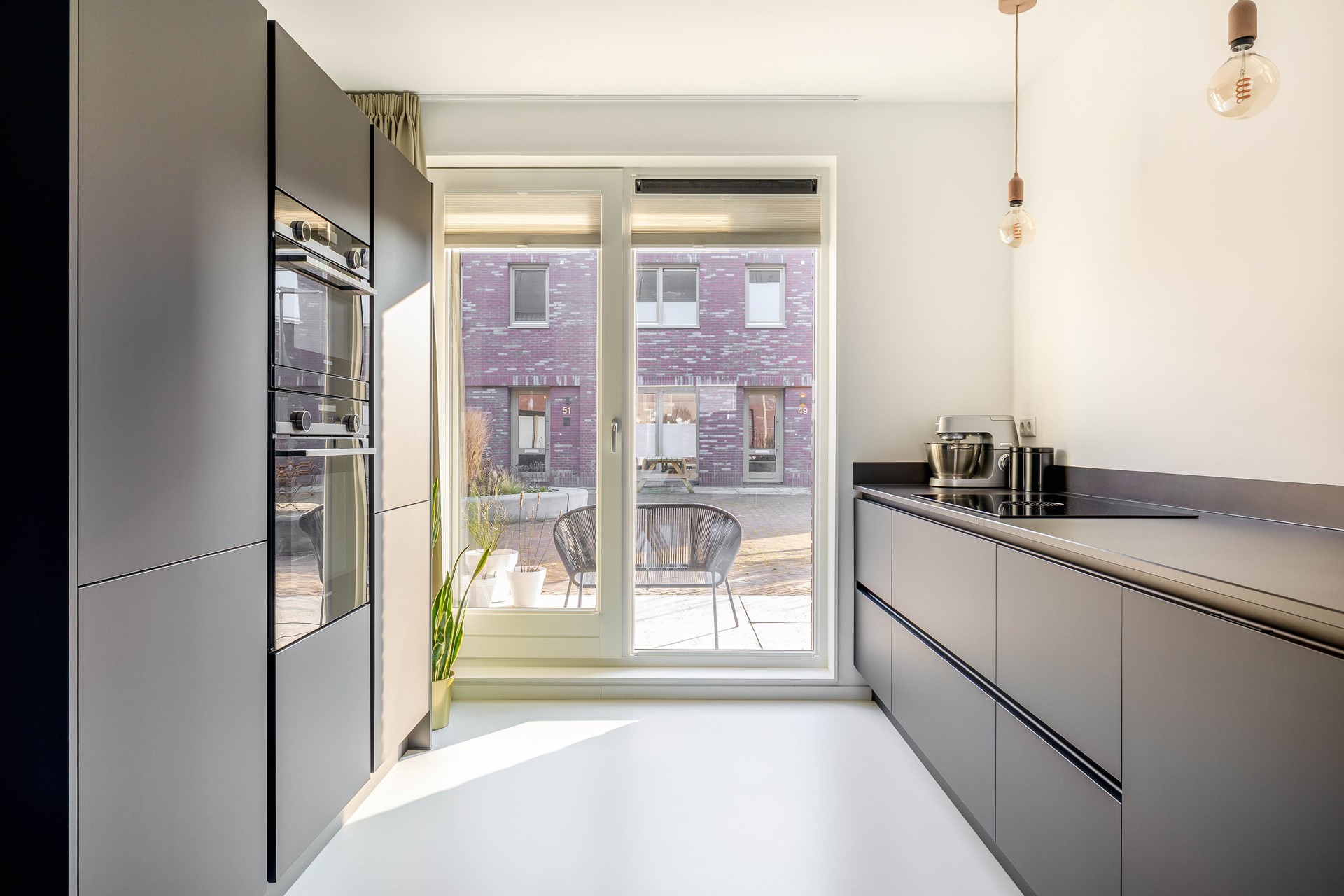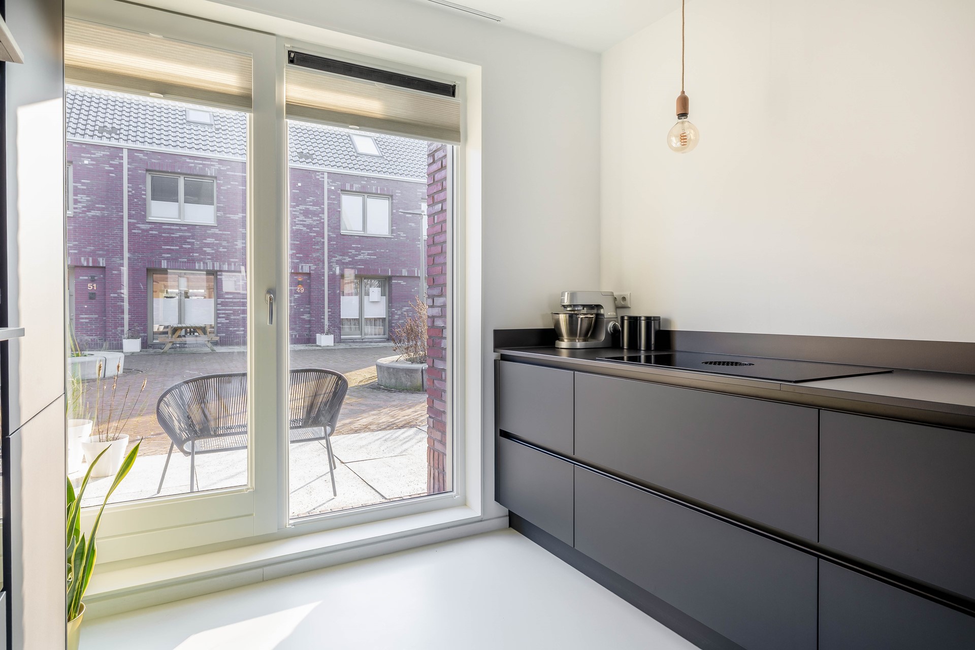 Uniek is de toegang vanuit de keuken tot het terras in de voortuin. Gelegen aan een groen en open pleintje waar buurtbewoners elkaar ontmoeten, kinderen veilig spelen en je makkelijk even buiten zit. Het voelt als een verlengstuk van je leefruimte en geeft deze woning net dat extra stukje gezelligheid.