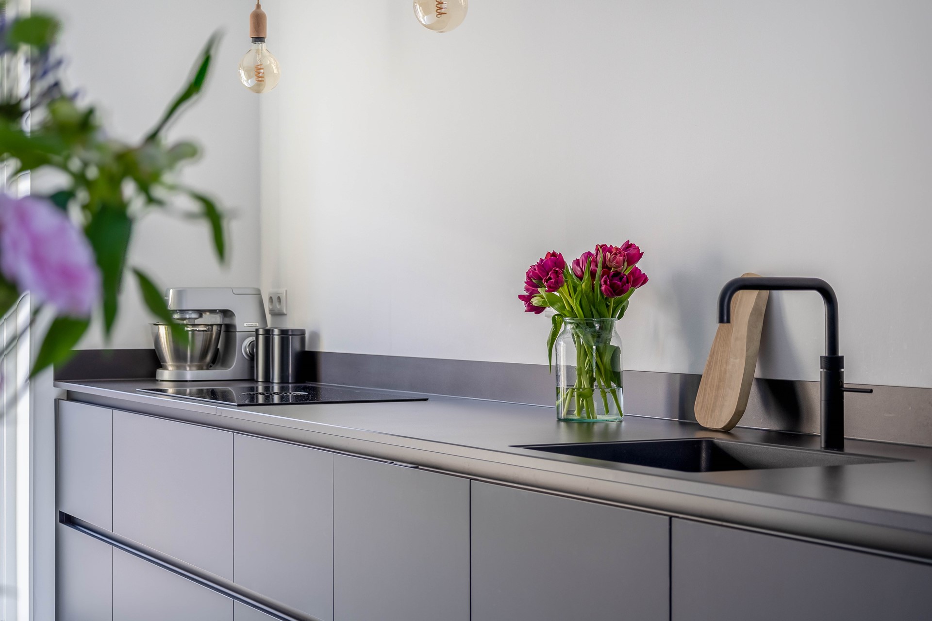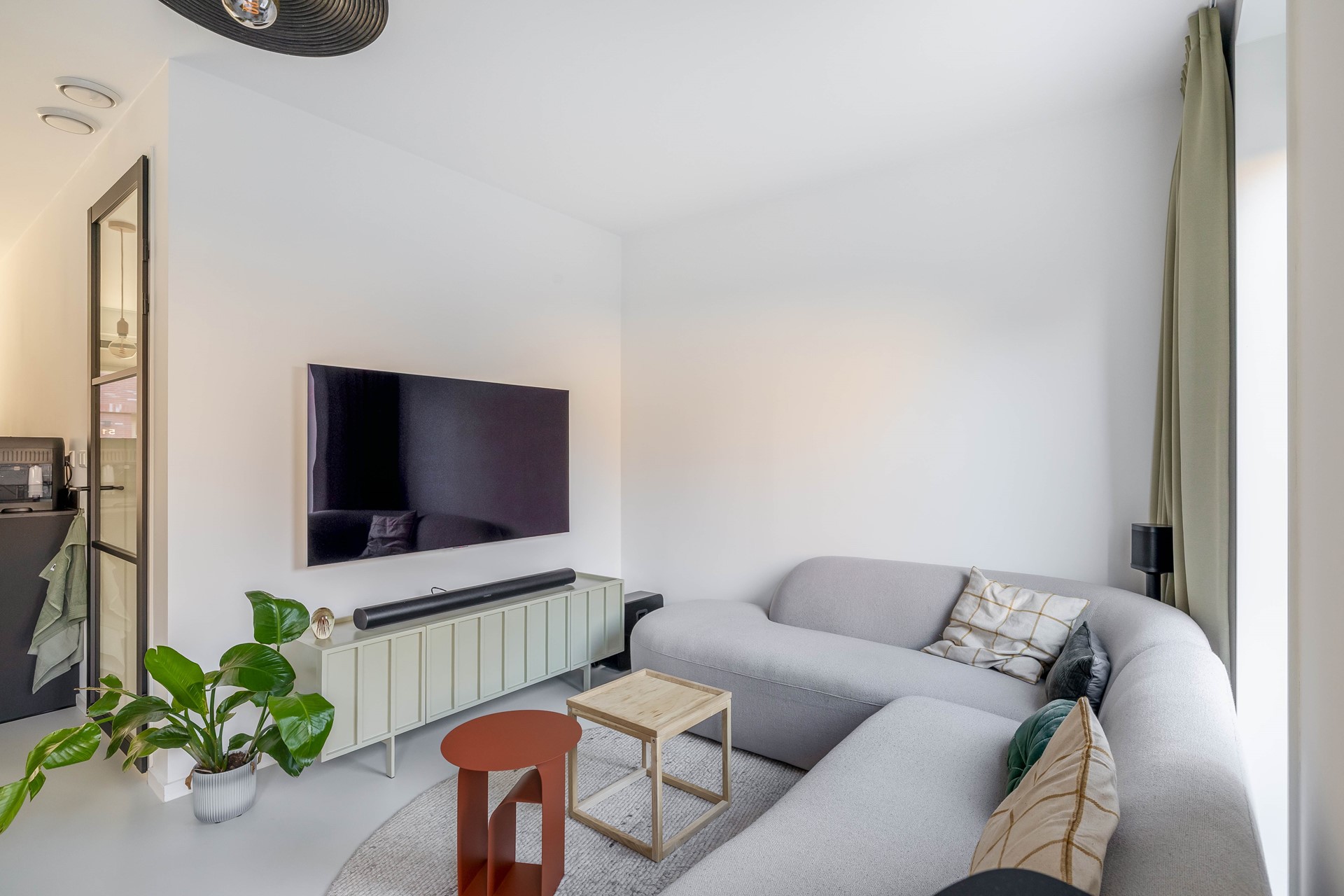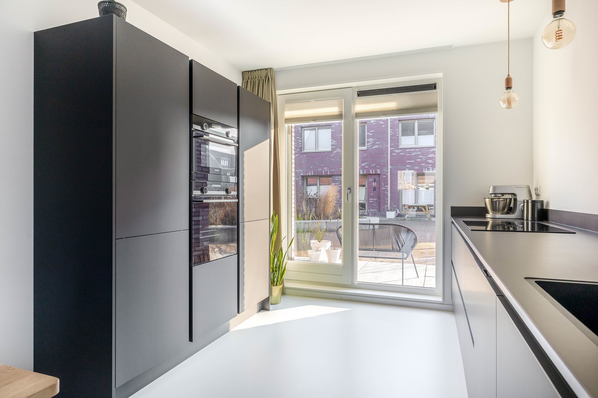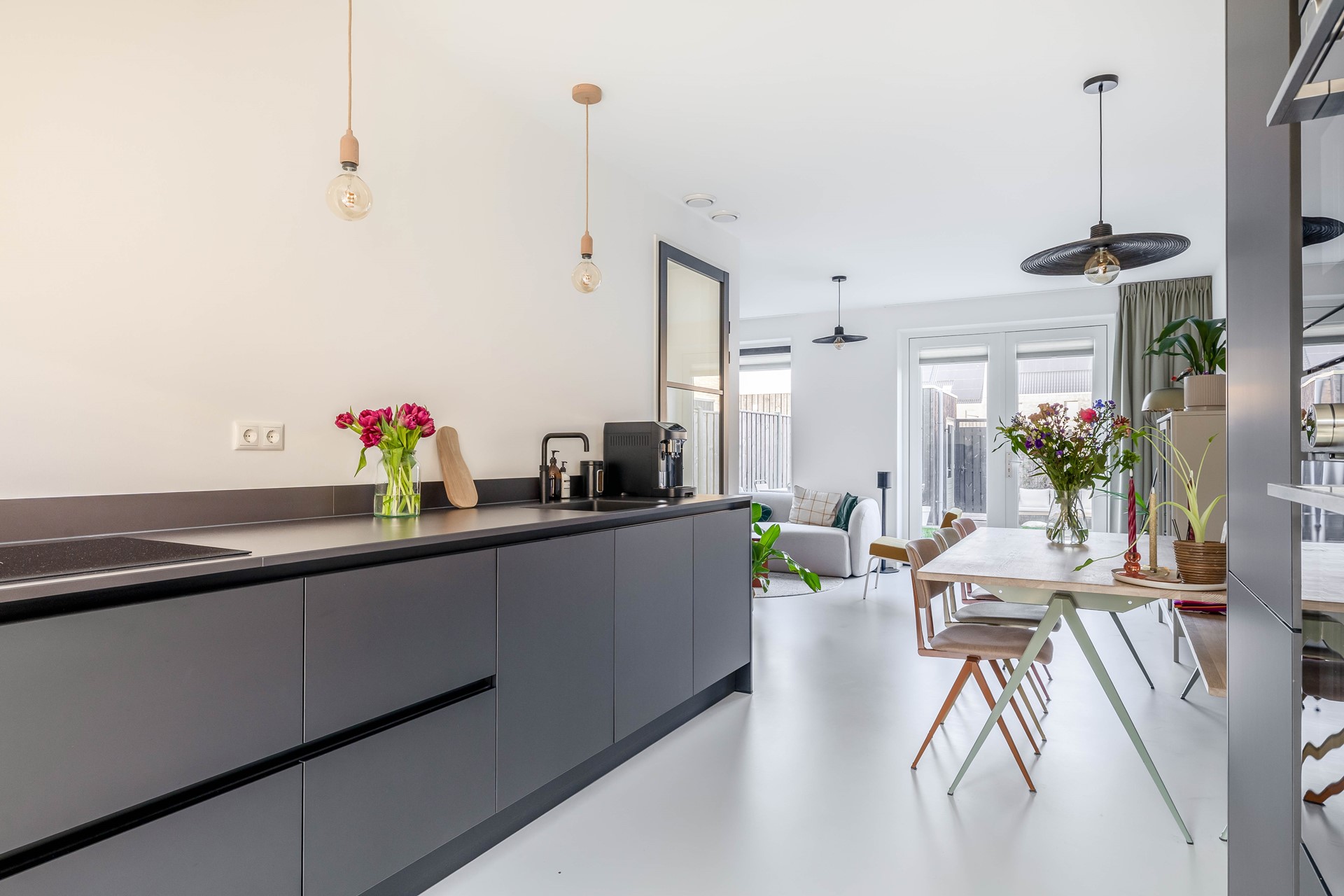 Binnen voelt het huis direct modern en warm tegelijk aan. De gehele begane grond is voorzien van een stijlvolle gietvloer met comfortabele vloerverwarming. In de hal vind je het moderne hangtoilet met fontein, waarna je doorloopt naar de gezellige woonkamer met knusse zithoek en veel licht. De open keuken vormt het hart van het huis en is ruim opgezet met complete inbouwapparatuur, waaronder een BORA inductiekookplaat met geïntegreerde afzuiging in het Dekton aanrechtblad, dubbele oven, koel-vriescombinatie, vaatwasmachine en een Quooker. Een heerlijke plek om samen te koken en te genieten.