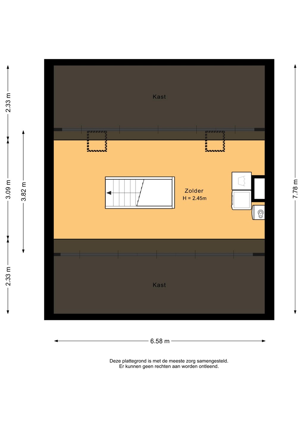 De tweede verdieping is een ruime open zolder met vaste trap en twee dakramen. Hier bevinden zich de cv-opstelling en de aansluitingen voor wasmachine en droger. Dankzij de ruimte en het daglicht is deze verdieping uitstekend geschikt als werkplek of hobbyruimte, met daarnaast volop bergruimte.