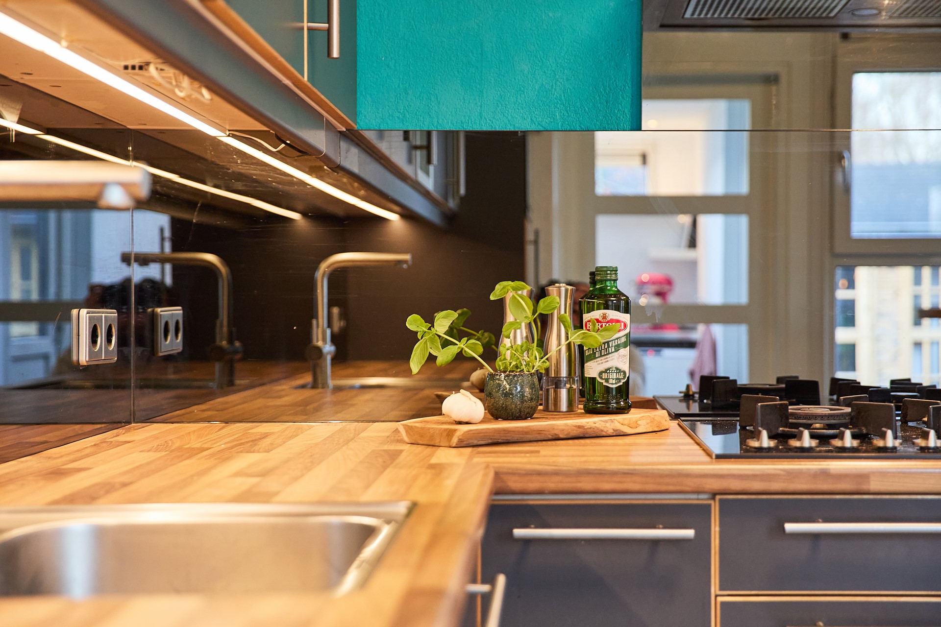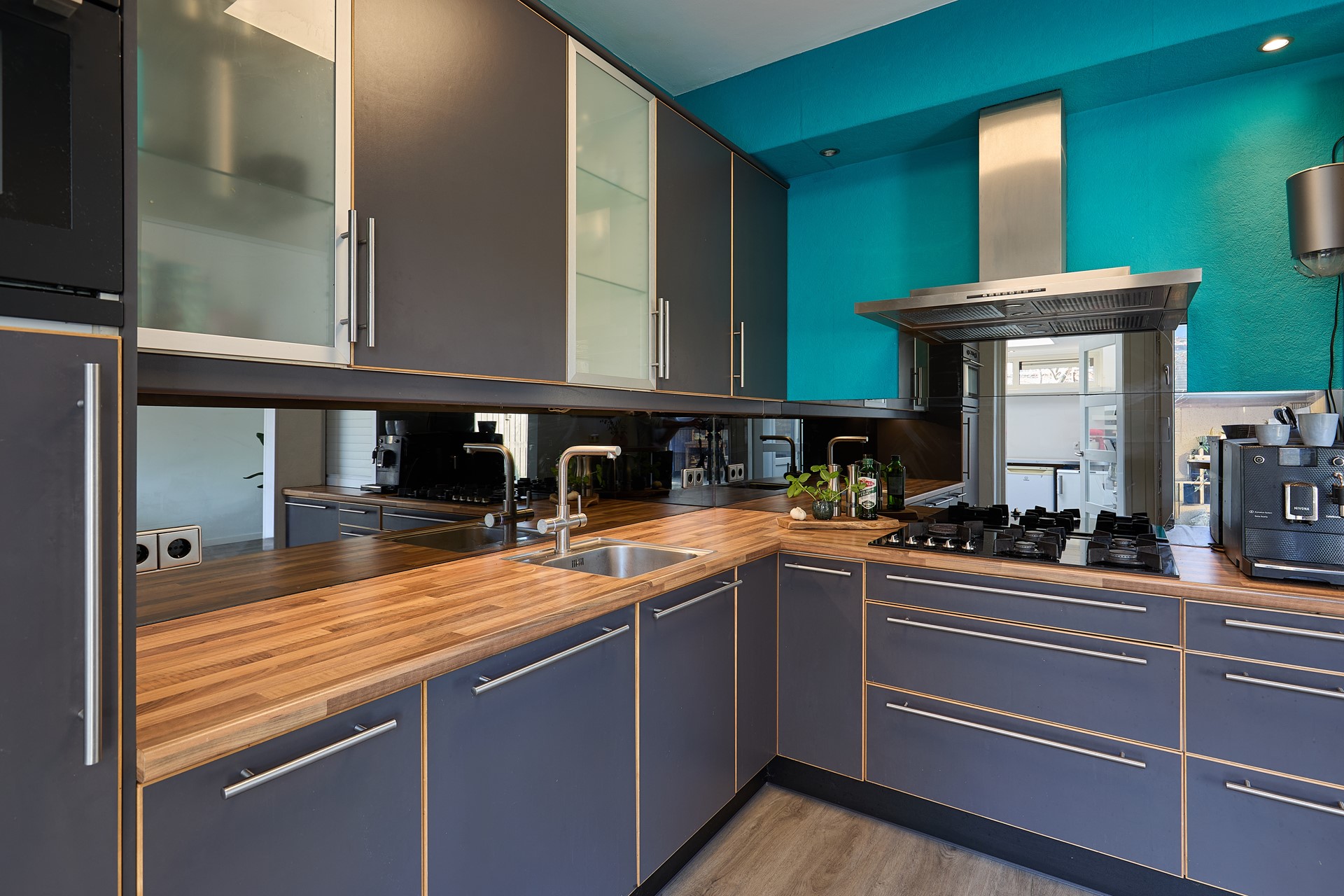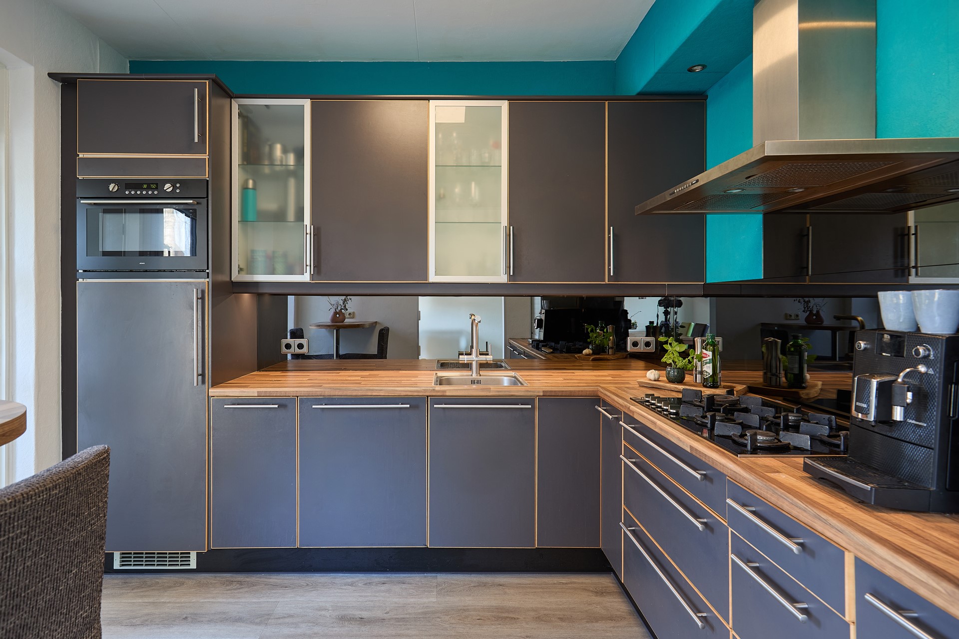 Binnen valt direct de prettige sfeer op. De woonkamer is licht en ruim en staat dankzij de schuifpui in directe verbinding met de tuin. De halfopen keuken is netjes en compleet uitgevoerd met diverse inbouwapparatuur: 5-pits gas-op-glas kookplaat met wokbrander, afzuigkap, combimagnetron, koelkast, vaatwasser en een moderne kokendwaterkraan. Aansluitend ligt de praktische bijkeuken met extra keukenblok, heteluchtoven, ruimte voor een extra koelkast of vriezer, witgoedaansluitingen en een deur naar de achtertuin. De begane grond is vrijwel volledig voorzien van een fraaie pvc-vloer met vloerverwarming.